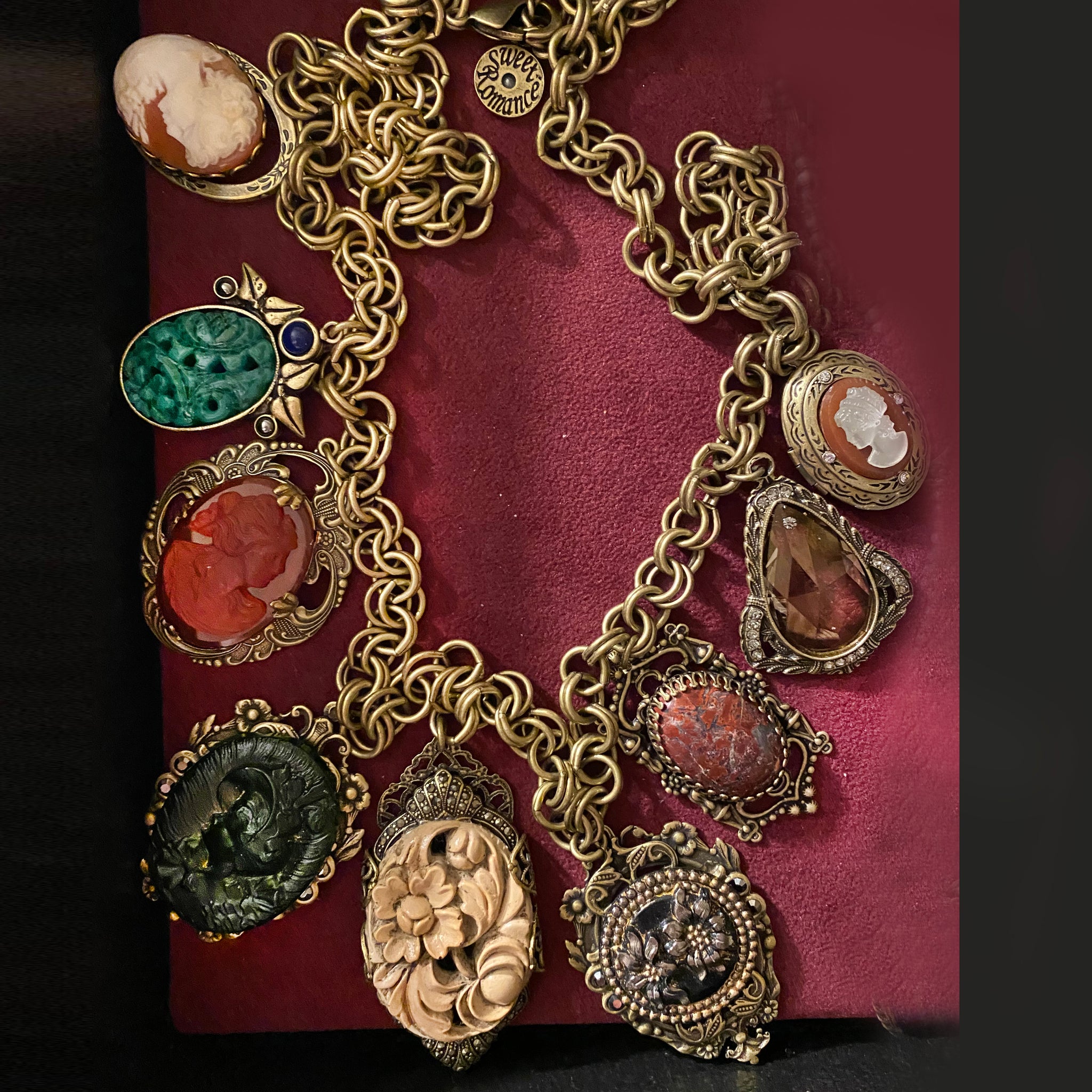 A Balkan fortune-teller would have worn such an opulent, mysterious necklace! The large ornamental charms -- cameos, carved jadeite and vintage glass -- are set in a collection of intriguing links that offer visual richness. Full of intricate detail, antique elements and a locket. Sure to be an object of admiration and curiosity! When I look at this necklace, I think of the mystique of gypsies and artisans that brought their imaginations to glassmaking in the early 20th century. A true limited edition piece. Signed and copyrighted Sweet Romance USA