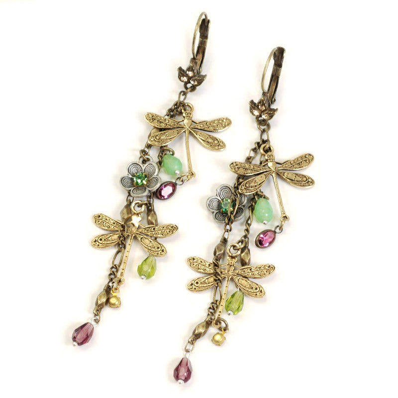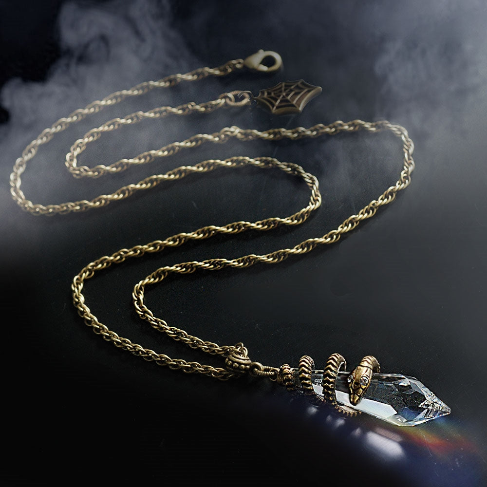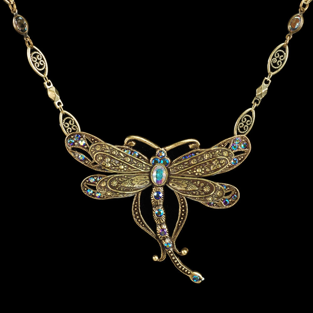 Necklace features a garden trellis adorned with a dangling bird and crystal. -