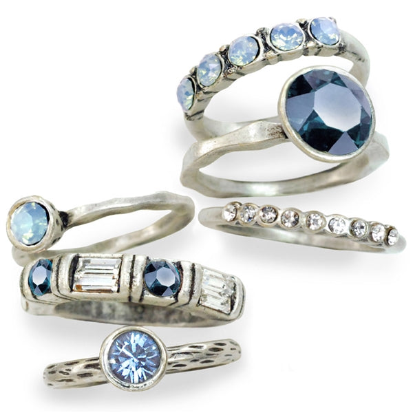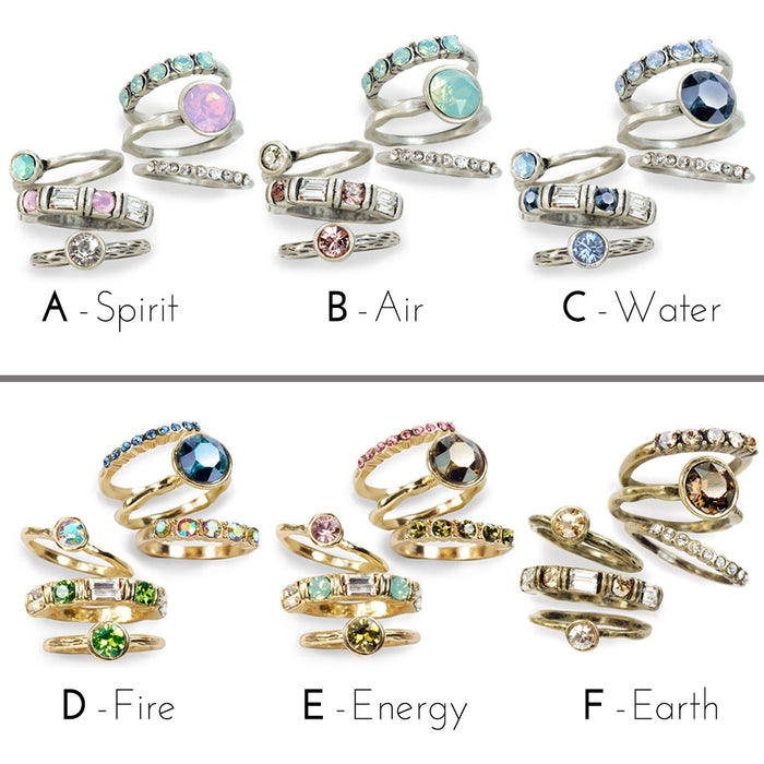 The 6 mystical forces of life. Six beautiful ways to celebrate vitality and balance. This is a set of 6 stackable crystal rings. Contemporary sculptured rings include 3 round solitaires, a band of baguettes and 2 different bands with round stones. Premium Swarovski crystal elements in unusual colors Finished in .925 silver, 14K gold and burnished Bronze US sizes 6, 7, 8, 9 and 10. Made in our Los Angeles studio.