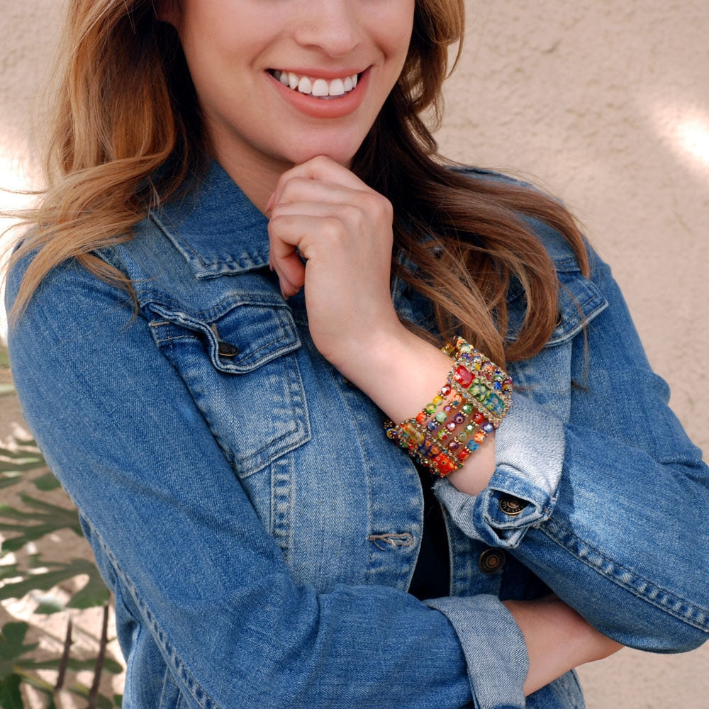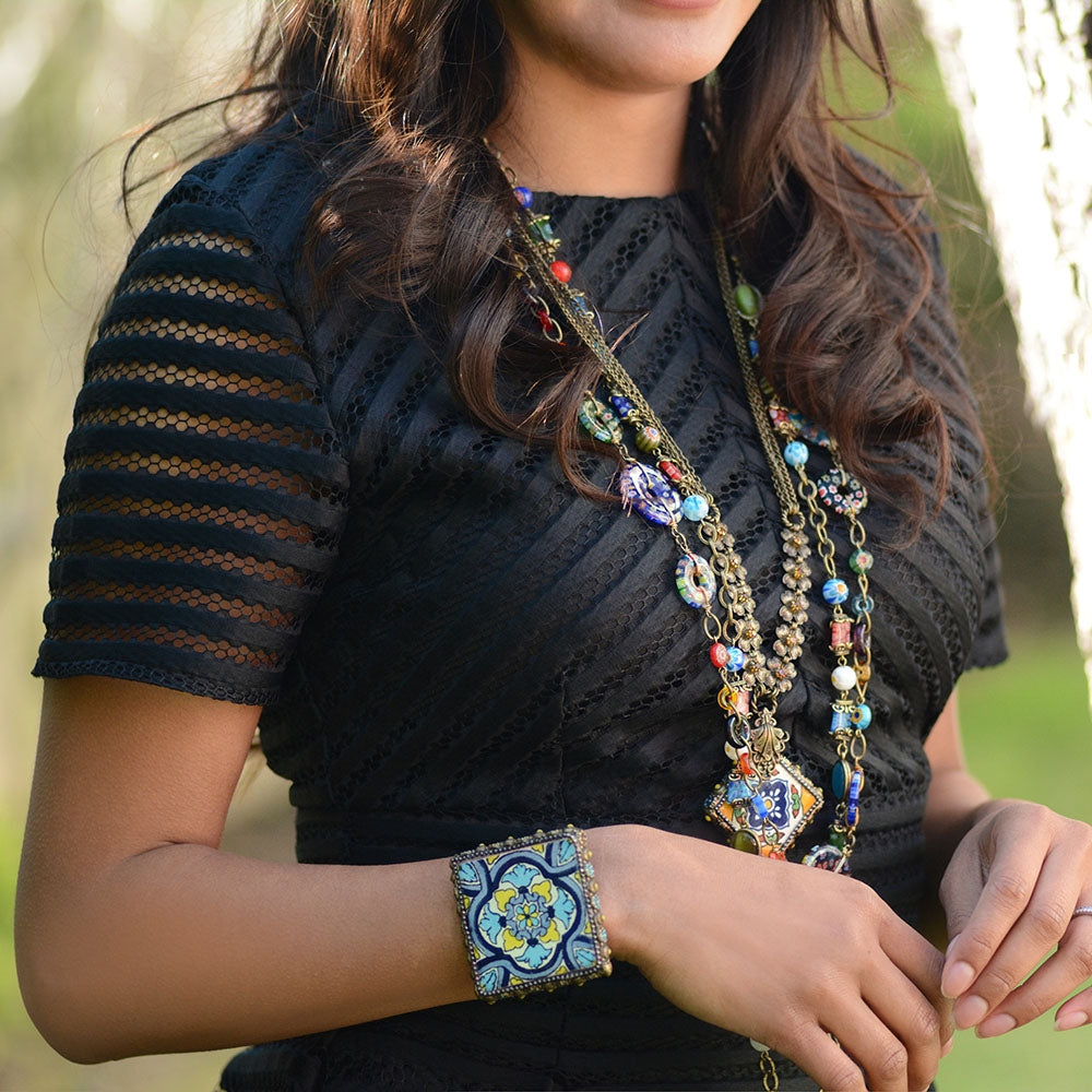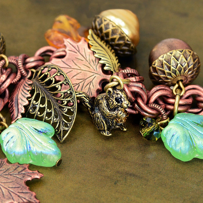 Sure to be a favorite autumn keepsake! Three hungry little squirrels are hiding among the leaves of our fall harvest bracelet of pearl acorns, art glass leaves and leaves of different trees in copper and bronze. The double rolo link bracelet is fastened by a byzantine c clasp. Warm and whimsical yet sophisticated and timeless. Adjustable up to 8" length (20 cm.) Warm and whimsical yet sophisticated and timeless. Made at Sweet Romance in our Los Angeles studio.