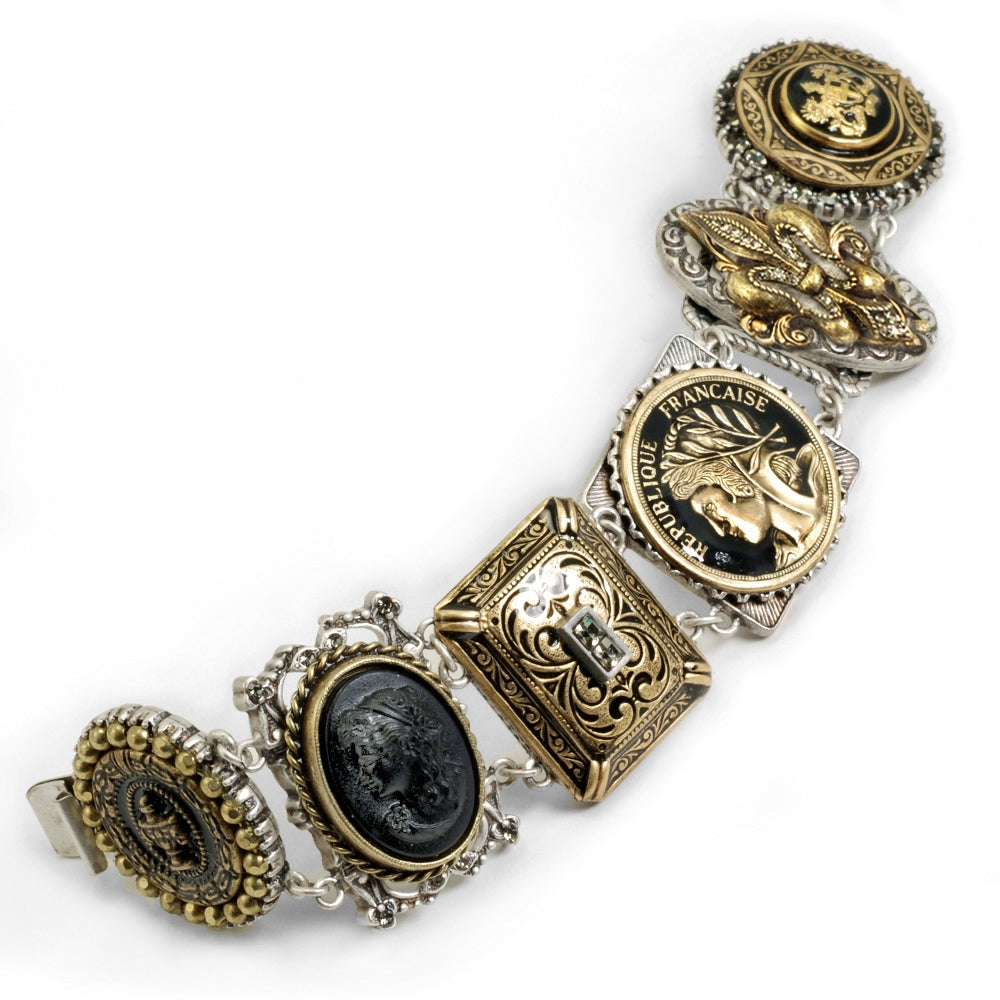 In the 1940s, larger, expressive costume jewels became indispensable accessories to fashion. Throughout autumn, department store jewelry counters swelled with novelty pieces. Lavish charm bracelets were the rage! Designers created them with metal stampings, glass and bakelite. Even natural nuts and pods were clustered on bold chain to make a fashion statement.